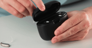 To activate the Noopl, you must first plug it into the bottom of an iPhone. After downloading the corresponding app, pair it with any “made for iPhone” hearing aids (which includes all models of Apple AirPods). After you’ve connected the Noopl and paired your made-for-iPhone hearing aids, you are ready to use the device.