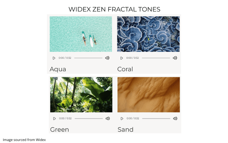 Inspired by the calming effects of certain types of music, Widex created Zen fractal tones. These sounds are based on fractal technology and consist of random, chime-like tones. They are designed to help with relaxation and make tinnitus less noticeable.